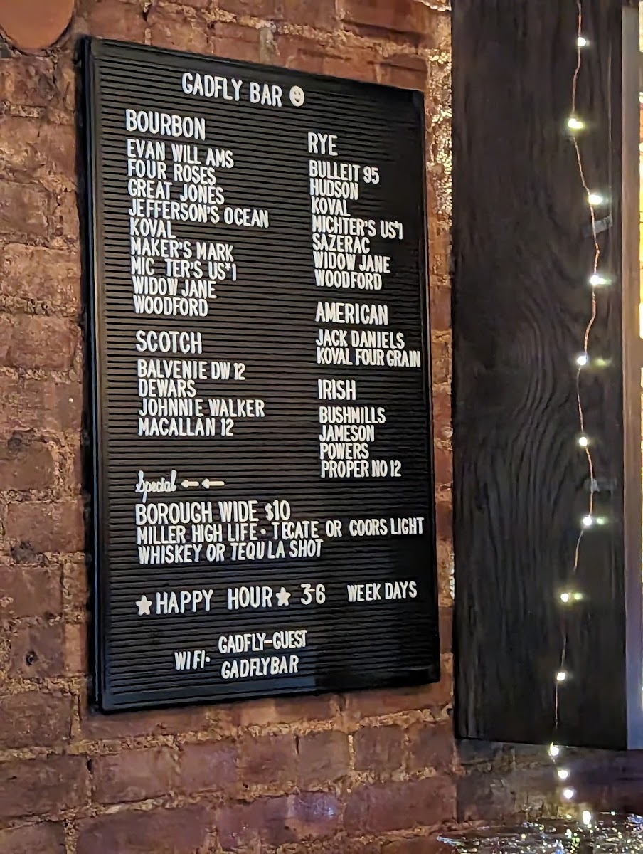 Welcome to Gadfly Bar, a vibrant New York City spot nestled at 258 W 15th St. This lively bar offers an enticing menu perfect for sharing and snacking. Start with the Gadfries—Belgian-style fries served alongside your choice of sauce, or indulge in the warm soft pretzel paired with beer cheese. For heartier options, the Smash Burger with double patties and sharp cheddar is a standout, embodying classic flavor in a cheerful atmosphere. The crispy chicken sandwich is another crowd favorite, crunchy and deliciously seasoned. If you're in the mood for flatbreads, try the Prosciutto Soppressata flatbread, perfect for those who appreciate bold charcuterie. The cocktail menu is equally impressive, featuring crafted drinks like the Fawlty Sour and the innovative Cup'o Joe. With friendly service and a cool vibe, Gadfly Bar is a must-visit for a good time.